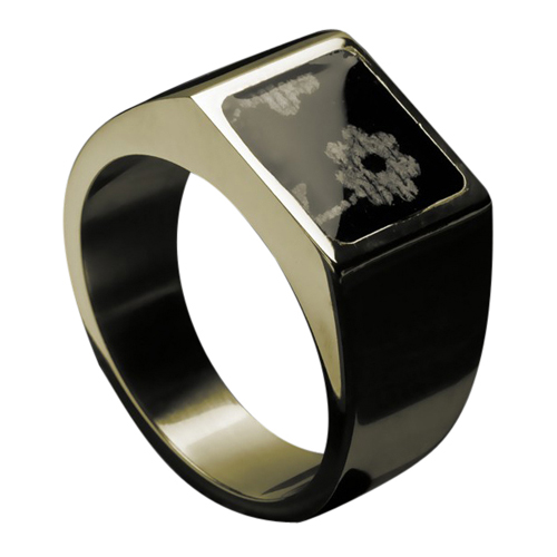 Vierkante zegelring met open askamer. De askamer kan voorzien worden van transparante (doorschijnende) kleuren, maar ook in opake (niet doorschijnend) kleuren.