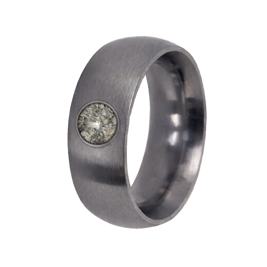 Deze bolle asring in titanium met een ronde open askamer is een echte eye-catcher. 1 werkdag na het plaatsen van uw bestelling ontvangt u per mail de instructies om een beetje as aan ons toe te sturen per aangetekende post.
