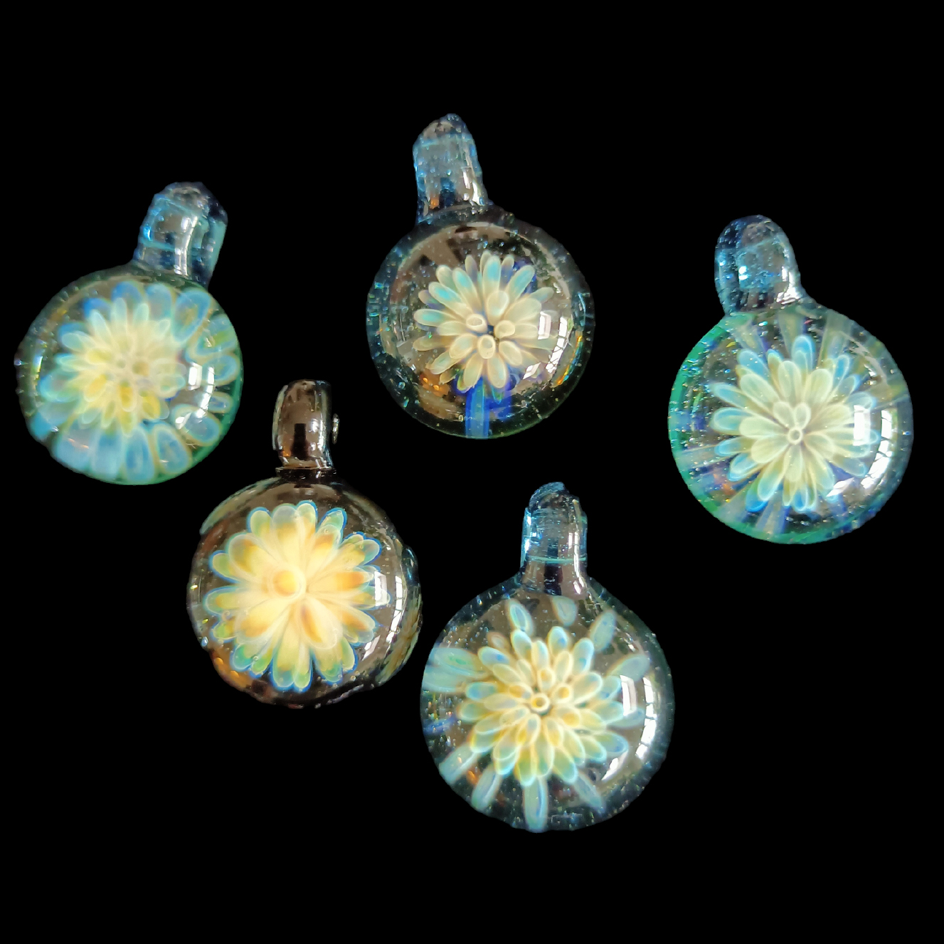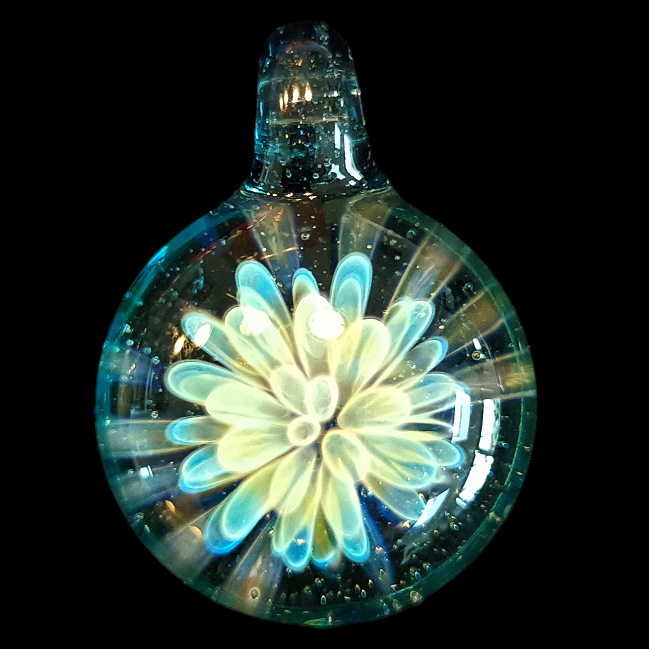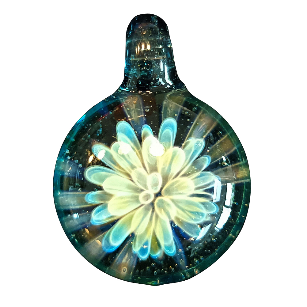 Prachtige handgemaakte glazen hanger met Dahlia ontwerp in de kleurcombinatie lichtblauw - blauw - amber. Deze combinatie geeft een mooi contrast met de kleurtinten van de Dahlia bloem. Deze prachtige hanger heeft een diameter van 2cm en een platte achterkant waardoor de hanger comfortabel is te dragen. Deze unieke hanger is geïnspireerd op de Dahlia bloem, een symbool van elegantie en dat bovendien bekend is van het wereldberoemde bloemencorso in onze vestigingsplaats Zundert. Dit maakt de hanger niet alleen een mode-accessoire, maar ook een eerbetoon aan de prachtige corsowagens welke elk jaar gemaakt worden.