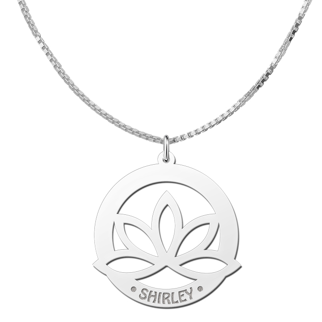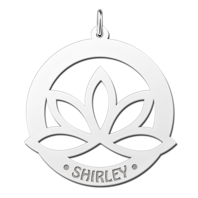 Zilveren bloemhanger met een Lotusbloem. De lotusbloem staat symbool voor puurheid en verlichting. Laat de bloemhanger graveren met een naam of tekst naar keuze. De hanger wordt op maat voor u gemaakt.
