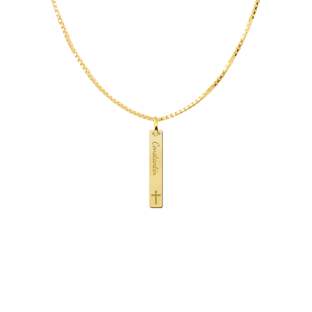 Op zoek naar een bijzonder en persoonlijk communie cadeau? Deze elegante gouden communie bar hanger met naam en kruis is een blijvende herinnering aan een speciale dag.