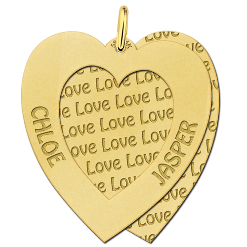 Een gouden familiehanger die bestaat uit 2 losse hangers. Op de achterste hanger staat een gravure met het woord 'Love'.