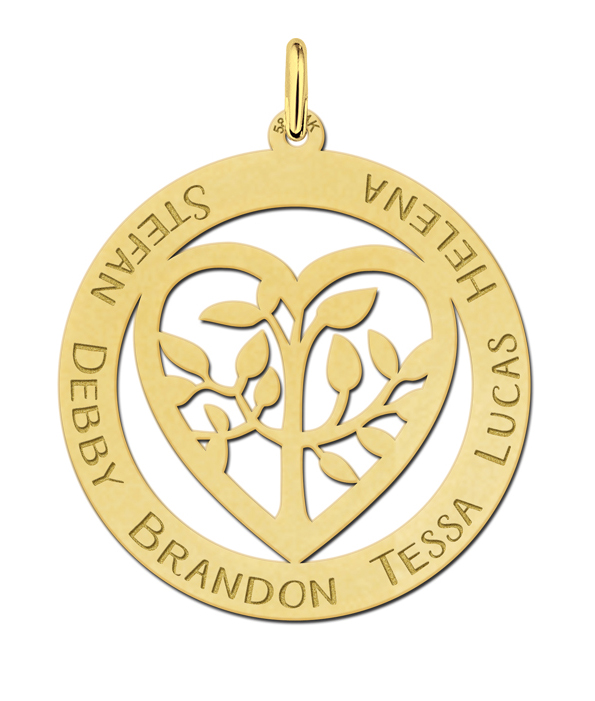 Een gouden familiehanger welke bestaat uit een hart met een levensboom.