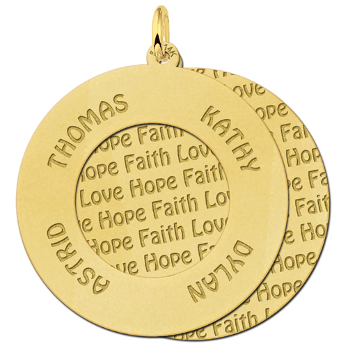 Een gouden Familiehanger wat bestaat uit 2 losse delen. Op de achterste hanger staat een opdruk met de woorden 'Love, Faith, Hope'.