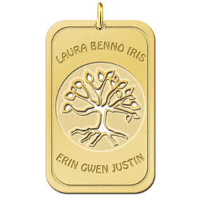 Een Gouden familiehanger in de vorm van een stoere dog tag. In de Dog tag vindt u een afbeelding van een stamboom.