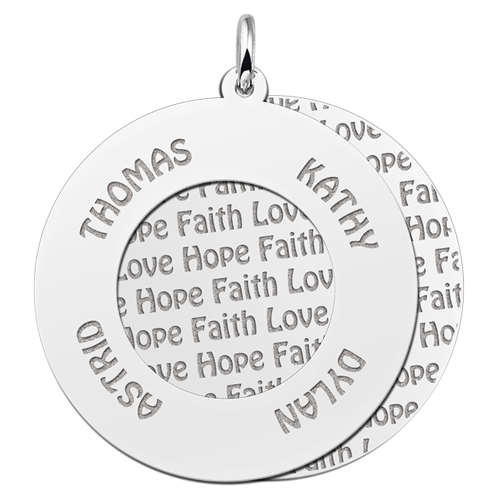 Een zilveren familiehanger wat bestaat uit 2 losse delen. Op de achterste hanger staat een opdruk met de woorden 'Love, Faith, Hope'.