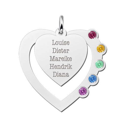 Deze zilveren hanger in een vorm van 2 hartjes met 5 geboortestenen is een mooi accessoire om te laten zien hoe trots je bent op je gezin, die je altijd bij je draagt.