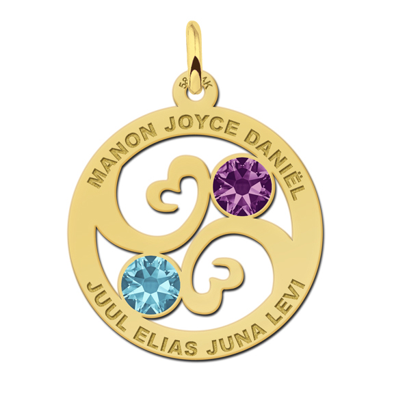 Deze prachtige familie hanger is gemaakt van 14 karaat goud. Er is plaats voor 1 of meerdere namen en twee steentjes, in een kleur naar keuze.