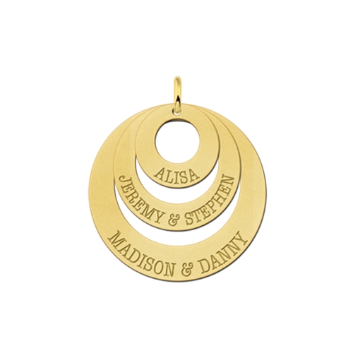 Deze mooie bedel heeft drie losse rondjes welke zijn verbonden door middel van een oogje, met een totale afmeting van 30mm. Het kleine rondje is 14mm en het middelste rondje 21mm. De hanger is van 14k geelgoud.