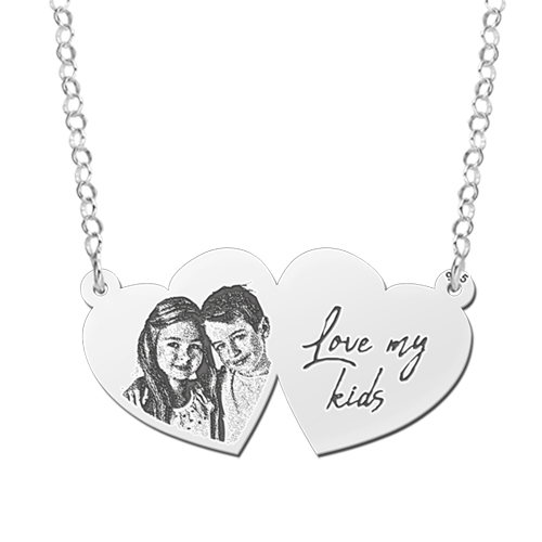 Deze prachtige dubbele harthanger kan worden gepersonaliseerd met uw foto en eigen handschrift. Maak er volledig uw favoriete hanger van!