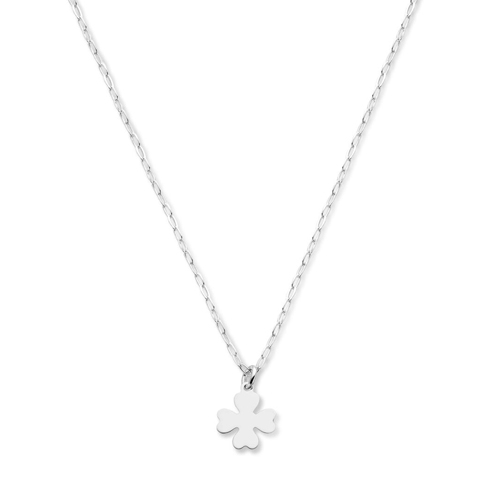 Laat het klavertje graveren met 1 letter naar keuze. Het klavertje is 11 x 13 mm. De 925 sterling collier met ankerschakels en een karabijn sluiting heeft een breedte van 1,7 mm. De ketting heeft een lengte van 41 + 4 cm.