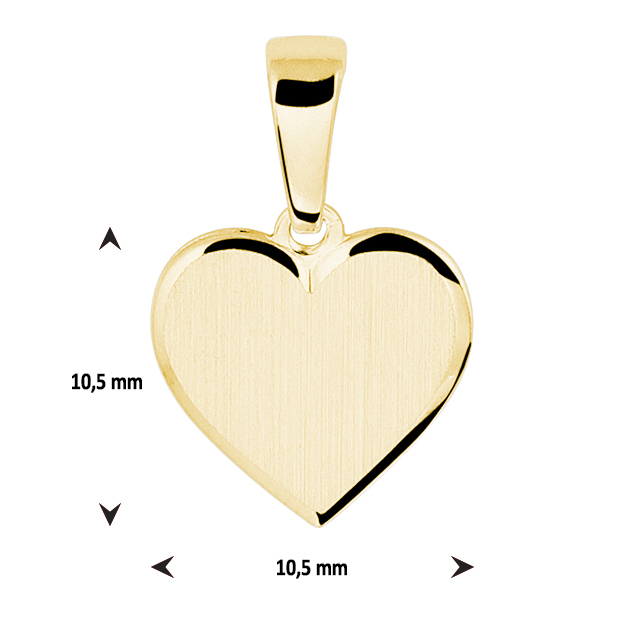 Geelgouden graveerhartje in de vorm van een hart met de afmeting 10,5mm. De hanger is gediamanteerd afgewerkt, dit betekend dat de hanger een sierlijk randje rondom bevat. Laat de hanger graveren met een tekst of een logo naar keuze. De tekst voeg je toe in de vervolgstappen. Kies hier een leuk lettertype uit. Een logo? De afbeelding upload je eenvoudig in de volgende stappen. Vanwege de matte afwerking van de voorzijde is het helaas niet mogelijk om een foto te laten graveren.