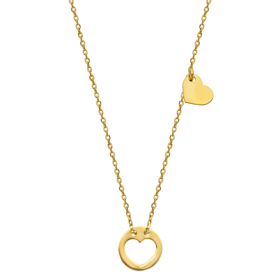 Gold plated gouden ketting met een subtiel hartjes bedeltje en een rond bedeltje met een open hartje. Laat het hartje van de ketting graveren met een letter, tekst of datum van maximaal 8 tekens.