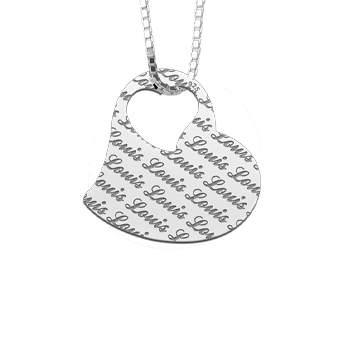 Zilveren naamhanger in de vorm van een sierlijk hart. De naamhanger graveren wij herhaaldelijk met de door u opgegeven naam. De naam wordt in prachtige sierletters gegraveerd. De hanger hangt schuin aan de meegeleverde zilveren venetiaanse ketting van 50cm welke verstelbaar is naar 50cm.