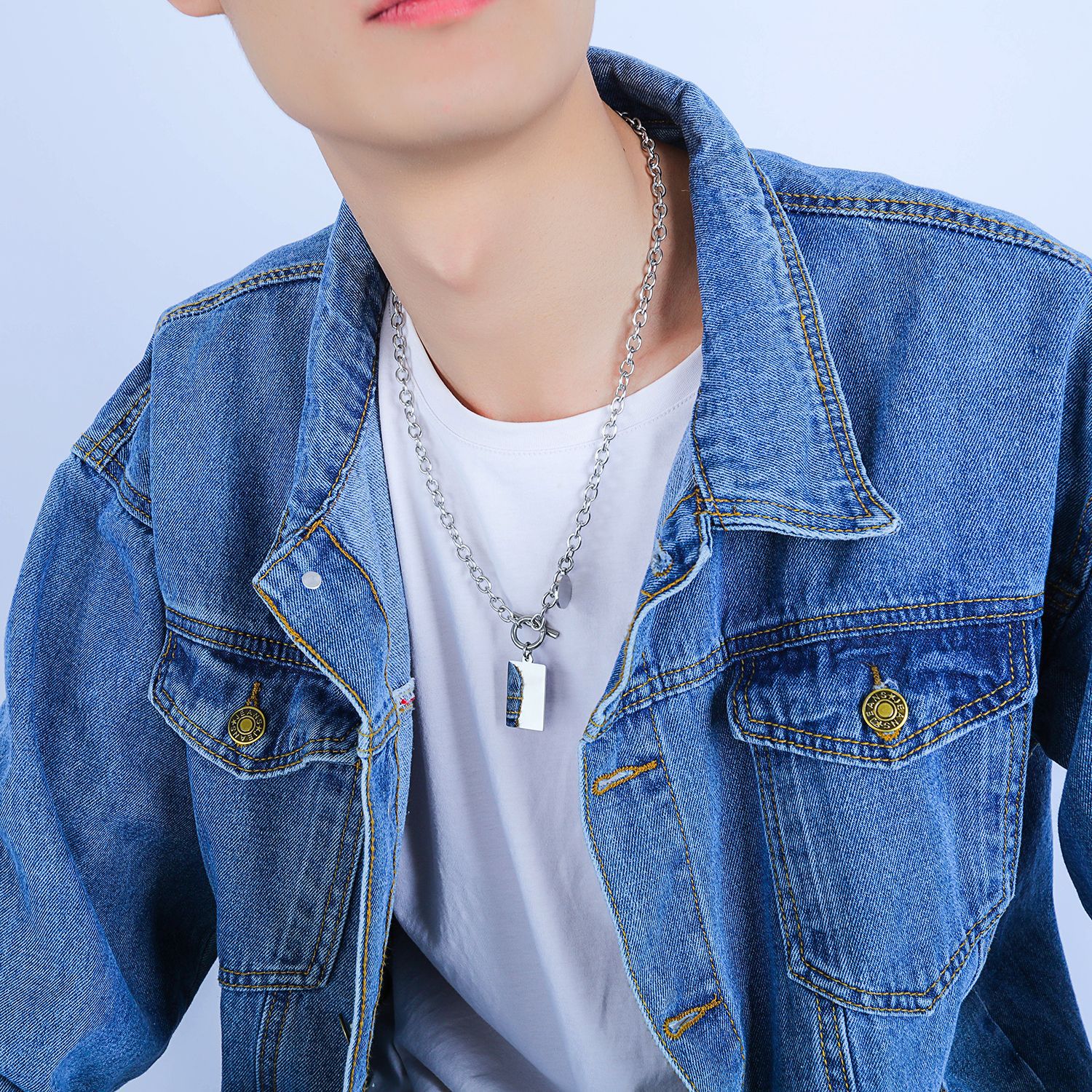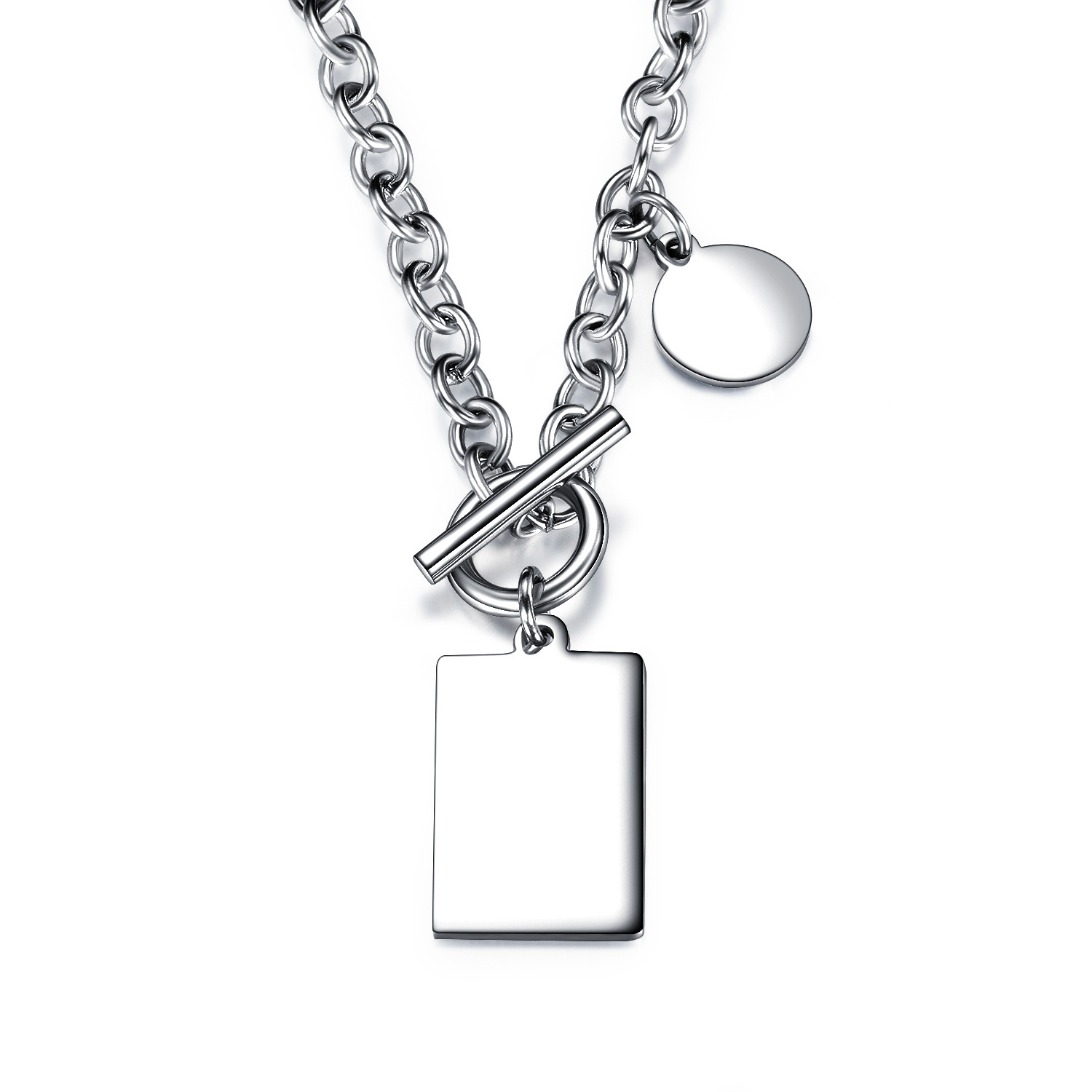 Deze zilverkleurige schakelketting met rechthoekige hanger is gemaakt van RVS. De ketting heeft 1 rechthoekige hanger met een grootte van 16 mm x 27 mm, ook heeft de ketting een ronde hanger met een breedte van 13 mm. De rechthoekige hanger kan gegraveerd worden met een tekst naar eigen keuze. Hierbij is er ruimte voor 4 tekstregels met maximaal 10 tekens per regel, dit is zowel op de voorzijde als de achterzijde mogelijk.