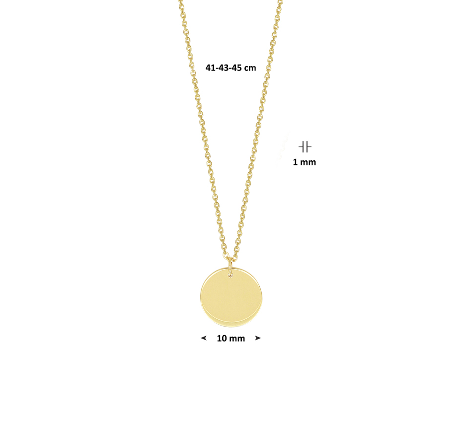 Ronde 14 karaats gouden ketting hanger in de afmeting 10mm. De ketting is verstelbaar in de lengtes: 41cm, 43cm en 45 cm.