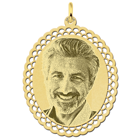 Ovale gouden hanger met foto. Rondom de foto wordt een mooie sierlijke rand verwerkt. U kunt de hanger tevens laten graveren aan de achterzijde met een tekst van maximaal 3 korte regels. Voor de gravure kunt u kiezen uit verschillende lettertypes.