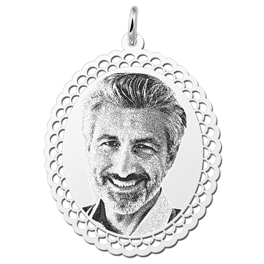 Ovaal zilveren hangertje met foto en een sierlijke rand. Aan de achterzijde van de hanger kunt u eventueel een persoonlijke tekst laten graveren. Wanneer u kiest voor een tekst, bieden wij u de mogelijkheid uit verschillende lettertypes te kiezen, zodat uw smaak tot zijn recht komt op deze hanger. De foto hanger is vervaardigd van 925 sterling zilver wat zorgt voor een optimale kwaliteit. De hanger is verkrijgbaar in de afmetingen 23x27mm en 28x33mm.