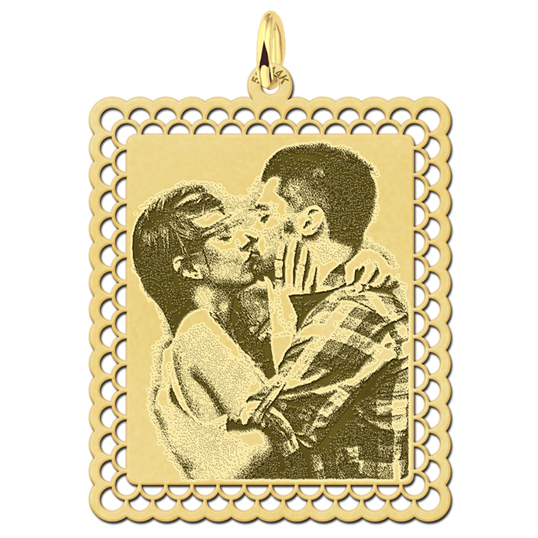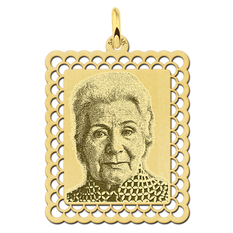 Rechthoekige gouden hanger met foto. Rondom de foto wordt een mooie sierlijke rand verwerkt. U kunt de hanger tevens laten graveren aan de achterzijde met een tekst van maximaal 3 korte regels. U kunt kiezen uit diverse lettertypes.