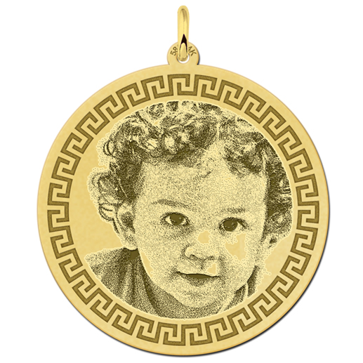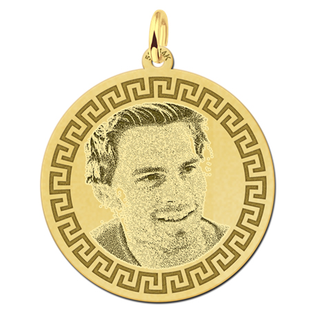 Ronde gouden fotohanger in een diameter van 27mm of 33mm. Rondom de foto wordt een mooie meander rand verwerkt. U kunt de hanger tevens laten graveren aan de achterzijde met een tekst van maximaal 3 korte regels. Voor de tekst gravure kunt u kiezen uit diverse lettertypes.