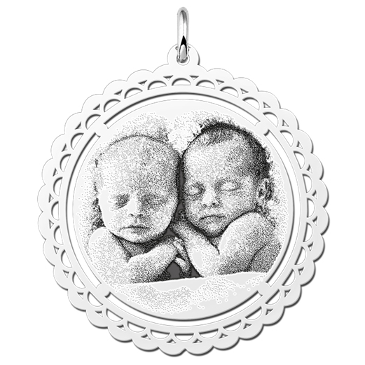 Ronde zilveren hangertje met foto en een sierlijke rand rondom. Aan de achterzijde van de hanger kunt u eventueel een persoonlijke tekst laten graveren. Wanneer u kiest voor een tekst, bieden wij u de mogelijkheid uit verschillende lettertypes te kiezen, zodat uw smaak tot zijn recht komt op deze hanger. De foto hanger is 33mm groot en is vervaardigd uit 925 sterling zilver wat zorgt voor een optimale kwaliteit.