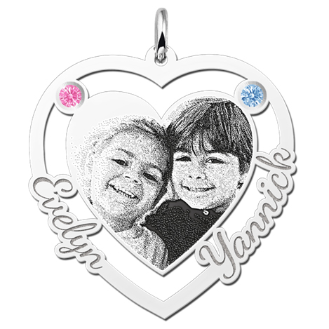 Draag uw geliefde op uw hart, met deze mooie zilveren fotohanger in de vorm van een hartje. Door de toevoeging van uw eigen afbeelding of foto wordt deze harthanger een uniek aandenken aan een geliefde of dierbare. De zilveren hanger is gemaakt van hoge kwaliteit 925 sterling zilver en wordt afgewerkt met twee schitterende geboortestenen, bijvoorbeeld die van de geboortemaand van u en uw kindje. Daarnaast is het mogelijk om naast de foto een tekst of naam te laten graveren. Zo wordt deze hartjeshanger een zeer persoonlijk sieraad.