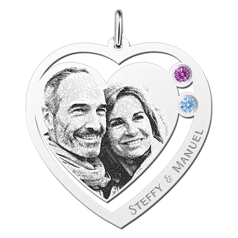 Een uniek geschenk, bijvoorbeeld voor een huwelijk. Met deze zilveren fotohanger weet u zeker dat een kostbare herinnering voor altijd in gedachten blijft. De hanger heeft een hartvorm waarop een afbeelding of foto naar keuze kan worden geplaatst. Aan de zijkant worden vervolgens twee fonkelende geboortestenen geplaatst. Ook kan de hanger worden voorzien van een persoonlijke tekst. Hiermee wordt deze fotohanger een prachtig cadeau voor een (jubilerend) bruidspaar of als bekroning van een speciale vriendschap.