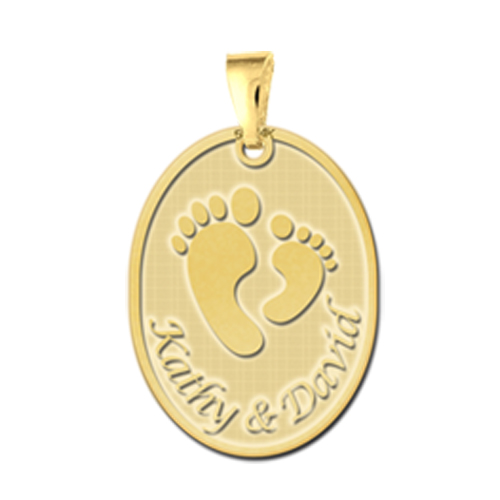Het gouden geboorte sieraad heeft een ovale vorm met daarin 2 voetjes.