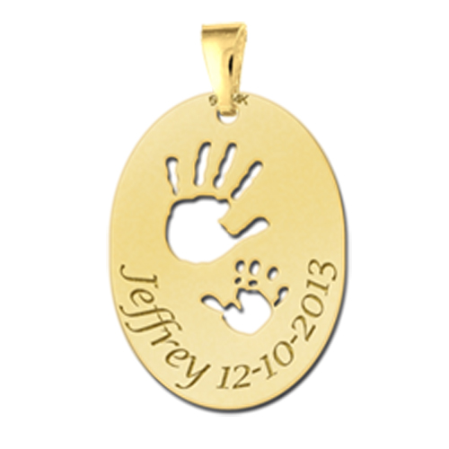 Het gouden geboorte sieraad heeft een ovale vorm met daarin 2 handjes.