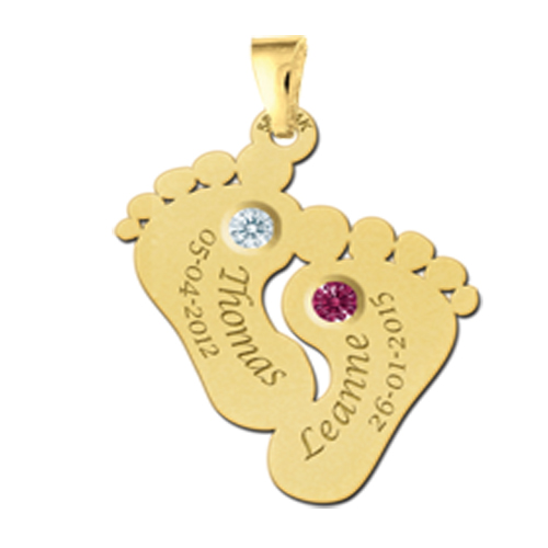 Gouden hanger voetjes met twee geboortestenen en datum