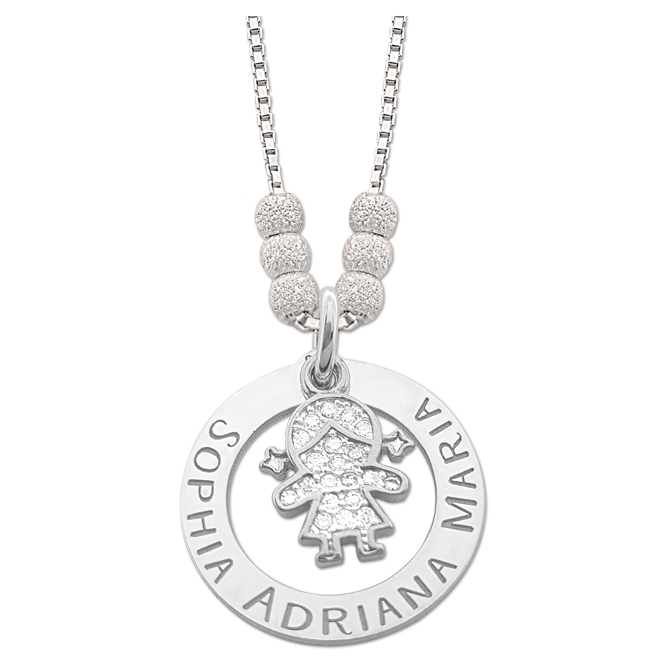 Deze zilveren set bestaat uit een zilveren venitiaanse ketting met 6 gediamanteerde kralen, een zilveren hanger met plaats voor een eigen gravure en een schattige bedel in de vorm van een meisje.