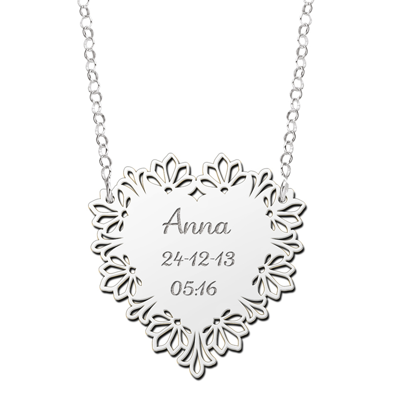 Dit verfijnde mama sieraad is hartvormig met een opengewerkte bloemen omranding.