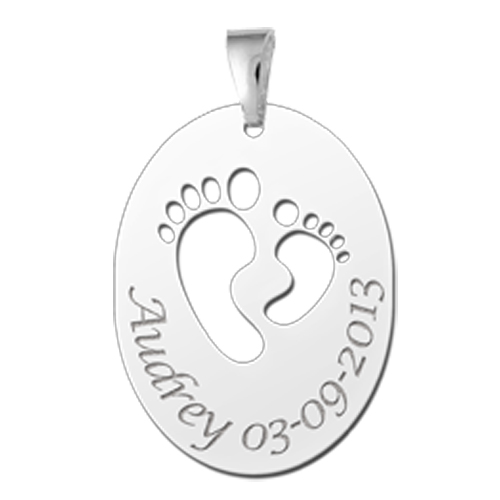Dit zilveren geboorte sieraad heeft een ovale vorm met daarin 2 voetjes.