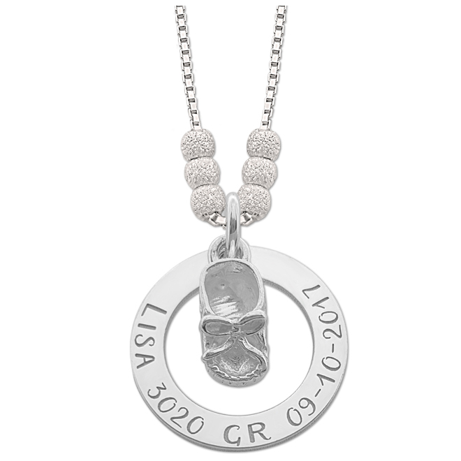 Deze zilveren set bestaat uit een zilveren venitiaanse ketting met 6 gediamanteerde kralen, een zilveren, ronde hanger met plaats voor een eigen gravure en een schattige bedel in de vorm van een baby schoentje.