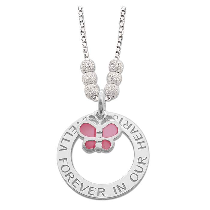 Deze zilveren set bestaat uit een zilveren venitiaanse ketting met 6 gediamanteerde kralen, een zilveren ronde hanger met plaats voor een gravure en een zilveren vlinder ingelegd met roze parelmoer.