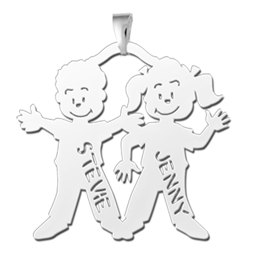 Zilveren mama sieraad  in de vorm van een lief meisje samen met een jongetje met ruimte voor 2 gravures, voor bijvoorbeeld namen of datums.