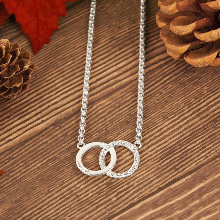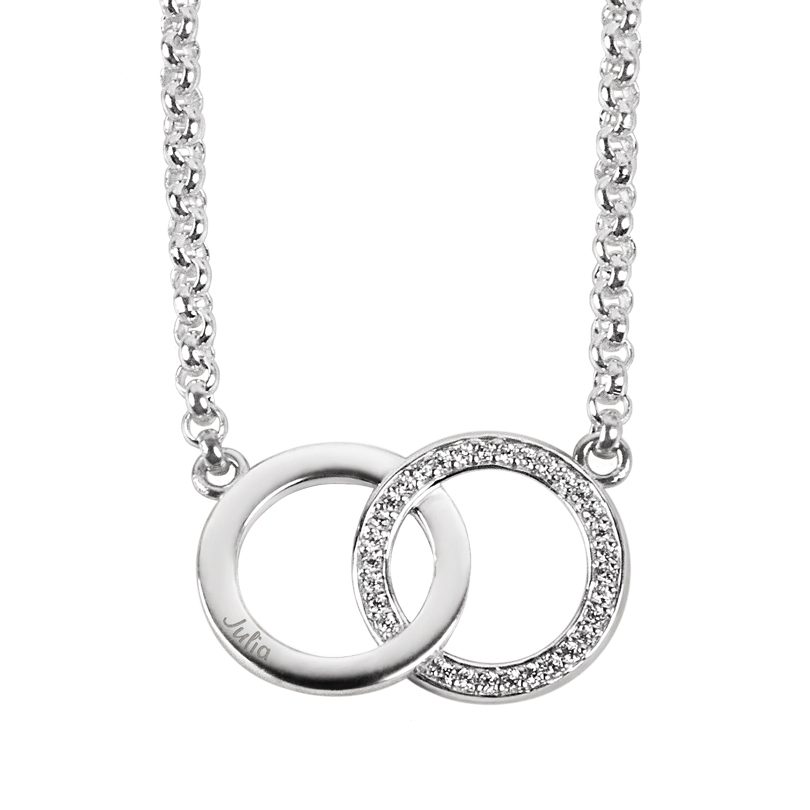 Een verfijnde zilveren hanger met twee cirkels die samen verbonden worden. Een teken van verbintenis.