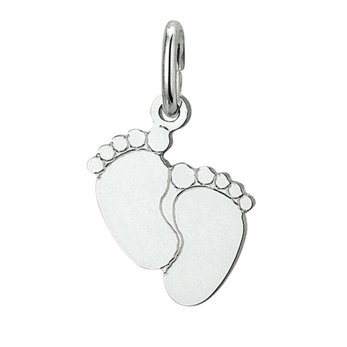 Hoogglans zilveren hanger in de vorm van een baby voetjes van 11 x 14,5 mm.Laat de hanger graveren met een tekst naar keuze op de voorkant en/of achterkant, dit kan in een sierlijke schrijfletter en een rechte letter.