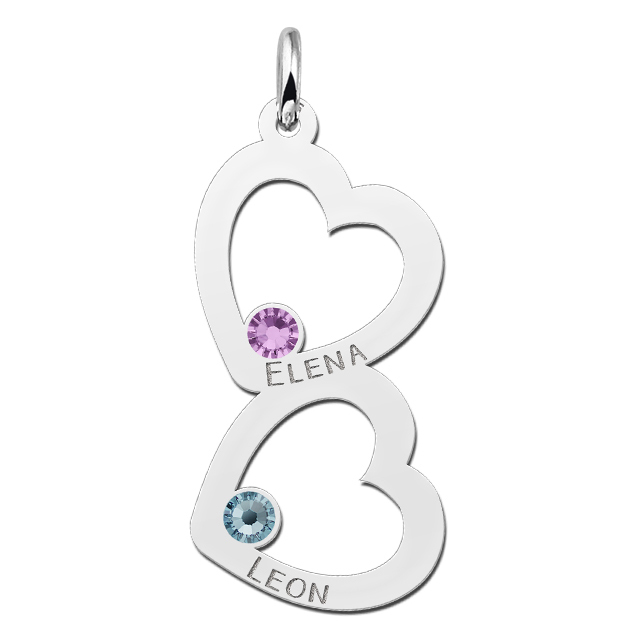 Zilveren familie hanger met twee harten en geboortesteen