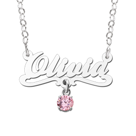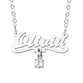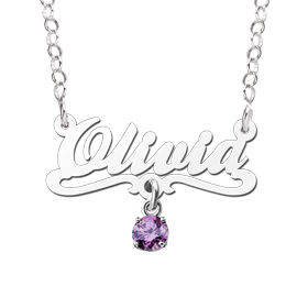 Deze mooie zilveren kindernaamketting heeft sierlijke krullen en een zirkonia steen onder de naam. Voor de kleur steen heeft u keuze uit blauw, paars, roze, wit, zwart, en rood. De jasseron ketting heeft een lengte van 35cm.