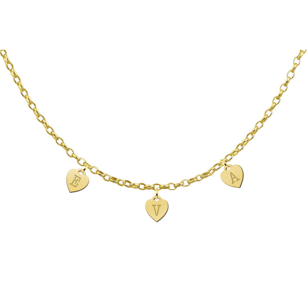 De naamketting is voorzien van 3 hartjes deze kunt u laten graveren met maximaal 3 verschillende letters of tekens. Laat bijvoorbeeld uw initialen graveren.