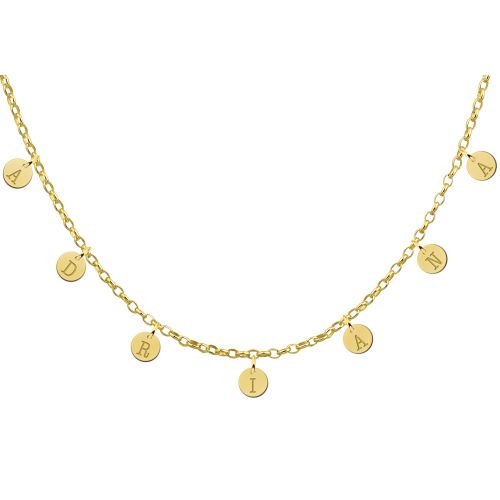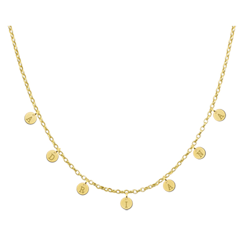 Vergulde naamketting voorzien van 8 ronde bedels welke u kunt laten graveren met maximaal 8 verschillende letters. Laat bijvoorbeeld een naam of initialen graveren.