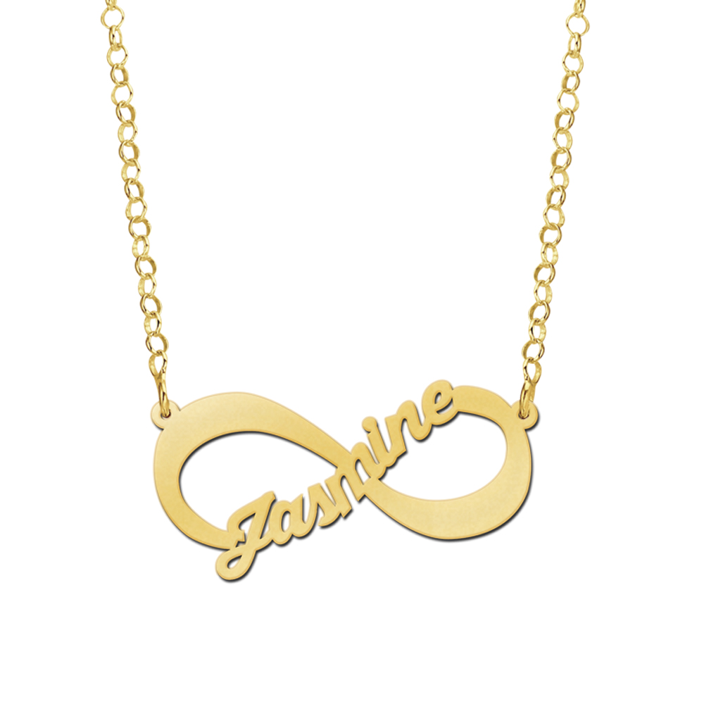 De vergulde hanger infinity met daarin een geschreven naam ca. 35mm x 15mm, wordt voorzien van de door u opgegeven naam of tekst.