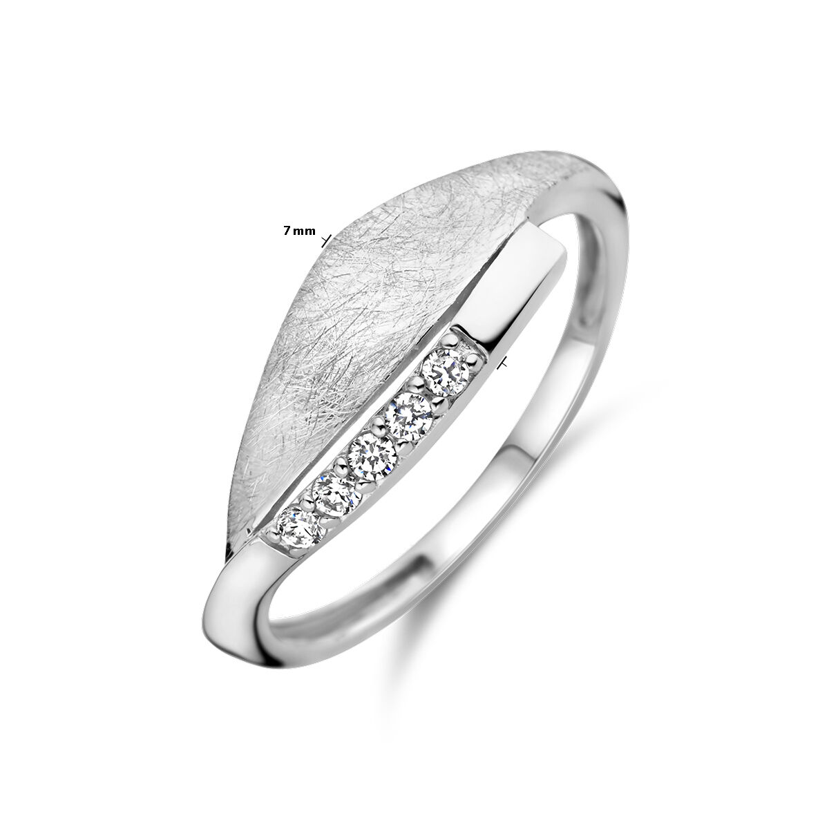 Het bijzondere ontwerp van deze zilveren ring combineert een matte, geborstelde zilveren baan met een glanzende band die bezet is met vijf sprankelende zirkonia's. In de binnenzijde van de ring is er tevens ruimte voor het graveren van een persoonlijke tekst. Dit kan een naam, datum of bijzondere uitspraak zijn.