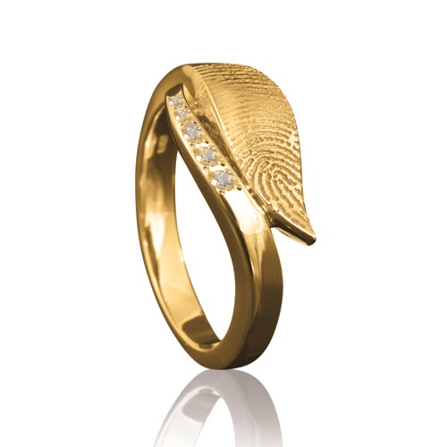 Set van twee gouden relatieringen met vingerafdruk. De vingerafdrukken worden verwerkt in de buitenzijde van de ringen. De damesring is een sierlijke ring met bovenin een breedte van 10mm. In de smalle rand zijn 5 stenen verwerkt. De herenring is standaard licht bolle ring van 8mm breed. Laat de binnenzijde van de ringen graveren met een tekst naar keuze in een sierlijke schrijfletter of een standaard blokletter.