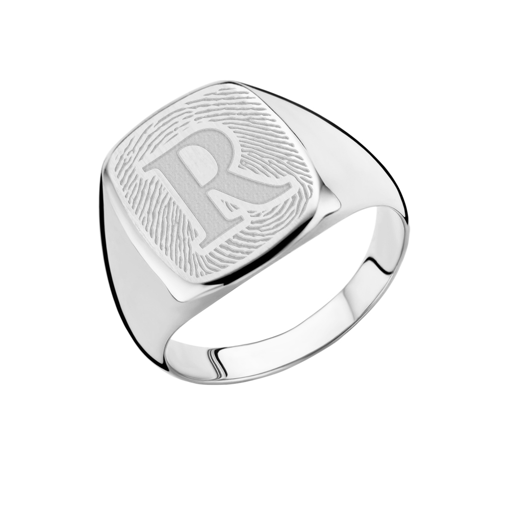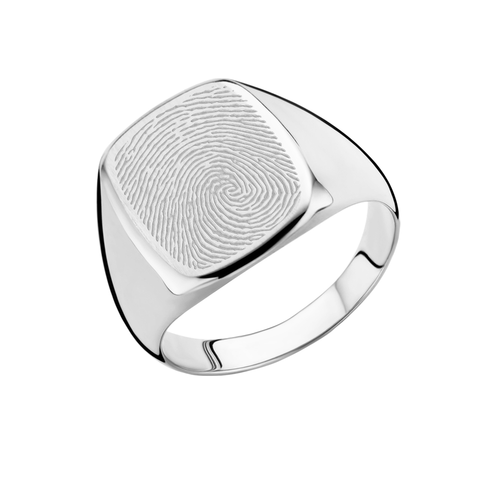 Rechthoekige zilveren zegelring en vingerafdruk Names4Ever