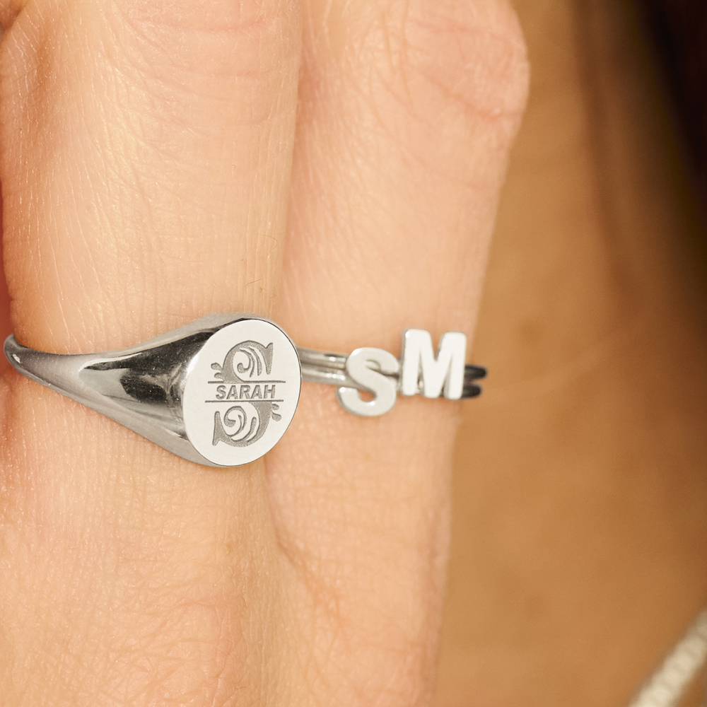 Deze zilveren ring met een letter bovenop is nu de nieuwste trend.