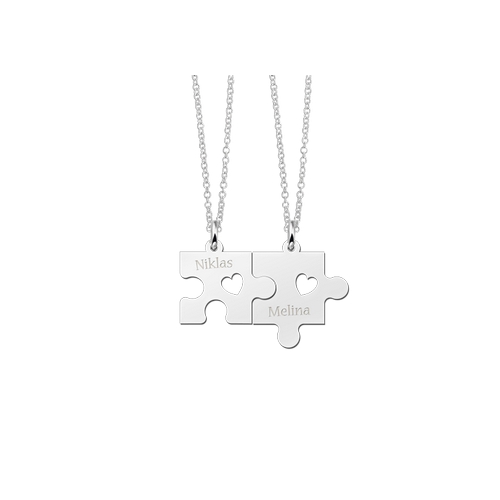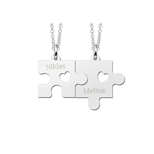 Koppel hanger puzzelstukjes met open hartjes. Elk puzzelstukje heeft een afmeting van 17x10mm en past in elkaar.