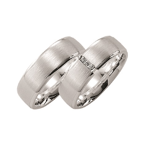 De hoogglans zilveren ringen zijn 6,5mm breed en bevatten een matte geborstelde baan welke rondom de ring loopt. De damesring bevat drie zikonia stenen welke tussen een opening in ring is geplaatst.
