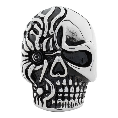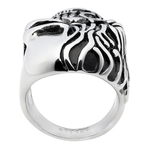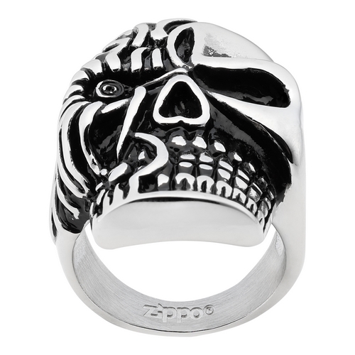 Zippo Skull ring. Een stoere hoogglans afgewerkte zilver met zwarte heren ring van roestvrij staal. De ring heeft een grootte van 2,3 x 3,3 x 0,5 cm.